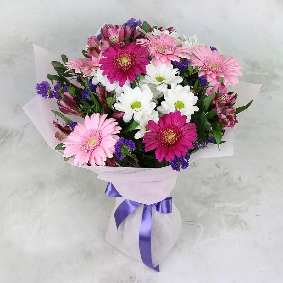 На фото букет «ягодный щербет». В составе: гербера 7 шт, альстромерия 3 шт, хризантема кустовая 4 шт, статица 2 шт, писташ 1 шт, дизайнерская упаковка 1 шт, атласная лента 1 шт, . Все цветы свежие и ароматные, букет красиво оформлен и отлично подходит для подарка. Доступна доставка цветов или самовывоз.